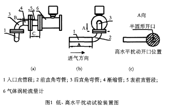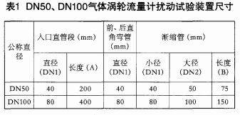 在大气压力条件下,借助于标准表法气体流量标准装置(以下简称标准装置),对于丹东东发集团有限公司生产的系列小口径气体涡轮流量计,选择DN50、DN100两种口径的流量计做扰动试验,即分别测试流量计低、高水平的无扰动与扰动条件下的指示误差,并进行比对、分析。