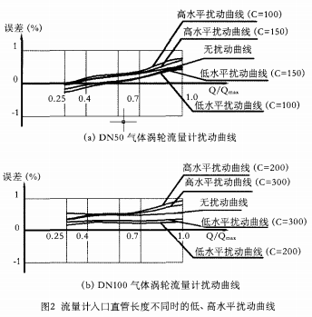 扰动试验可以验证气体涡轮流量计抗干扰性能的好坏,在给定安装条件下,扰动和非扰动条件下误差相差越大,表的抗干扰性能就越差,寿命就会越短。按照prEN 12261的要求,在0.25Qmax~Qmax间,扰动和非扰动条件下的误差变化应小于基本误差限的1/3。丹东东发(集团)有限公司生产的气体涡轮流量计在试验流量范围内的误差限为±l%,当入口直管段长2DN(DN公称直径)时,扰动试验前后的误差变化即符合规定的要求。因此,该类流量计在安装使用时,无论管道内流体的流动类型如何,只要入口直管段的长度达到2DN就可以了。