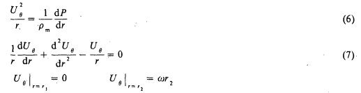 式中,Uθ为柱状坐标中沿θ方向上的线速度;P为圆柱环中的压力;这里r代表径向坐标;r1为轴承外半径;r2为轴承外壳体内半径。式(7)为欧拉方程,令r=et(t为中间变量),则t=1nr,对应式(7)的特征方程为