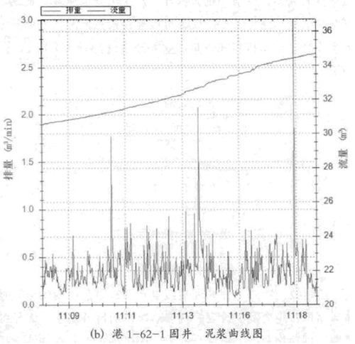 在固井全程的曲线中,也可以发现开始固井的时候,泥浆排量杂波较小,究其原因是刚开始固并时,泥浆管线刚泄压,管线中还是充满了液体,虽然振动强度雷同,但是叶片有阻尼,振幅较小,对其影响也较小。例如曲线图的11;03: 00-11: 03: 53之间的泥浆排量没有杂波。在港1-62-1固井过程中,水泥浆打了413澎,结果本应该是0的泥浆,却走数了23.0m³,其影响可谓巨大,并非通过普通的滤波或切除所能排除,必须执行一个特殊算法。