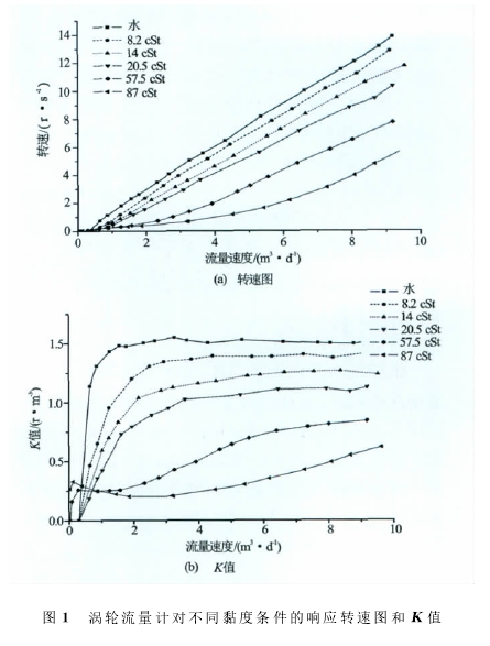 图1涡轮流量计对不同黏度条件的响应转速图和K值
