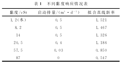 采用水和PAM溶液,在上述实验平台上对涡轮流量计在0~10m³/d的范围内的响应情况进行观察。通过调整配比,得到了纯水、8.2、14、20.5、57.5cst和87cst等6种不同表观黏度的流体并观察了直径19mm的涡轮流量计对其响应的情况。图1反映了涡轮流量计在低流量条件下对不同黏度的流体的响应情况。从图1可见,随着黏度的增加,涡轮流 量计的K值下降,且线性度也变差。对图1中各黏度条件下的响应结果进行线性拟合,并结合实验中测量到的启动排量进行比较得到表1所示数据.。