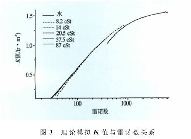 图3理论模拟K值与雷诺数关系是,在低流量条件下,涡轮流量计在启动时叶片相对于来流攻角较大,会产生流动分离的现象,此时会使得涡轮流量计的响应有一定的波动和偏差。因而,采用黏度较高的黏性流体,在不同雷诺数条件下进行标定之后,就可以对该涡轮对于不同黏性流体的响应情况进行分析和计算。