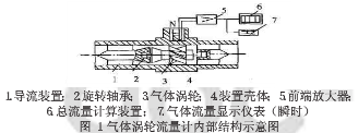 该流量计将内部涡轮安置在全封闭管道中,在管道中气体介质经过流量计以后,涡轮在受到一定的动能以后会进行转动,因此涡轮转动的速度通过换算就可以得到管道中气体的实际流量与流速,气体涡轮流量计内部结构如图1所示。
