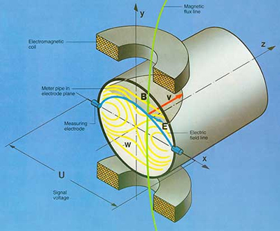当导电液体沿测量管在交变磁场与磁力线成垂直方向运动时,导电液体切割磁力线产生感应电势。在与测量管轴线和磁力线相互垂直的管壁上安装了一对检测电*,将这个感应电势检出。
