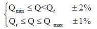 由图2 可见,仪表系数可分为二段,即线性段和非线性段。在非线性段, 实际特性受轴承摩擦力、流体粘性阻力影响较大。当流量低于Qmin 时,仪表系数随着流量迅速变化。压力损失与流量的平方成正比关系。通常线性段约为工作段的2/3,其特性与涡轮结构参数及流体粘性有关。随流量的变化其仪表系数K 也会有一定的变化,但变化不大,通常将其变化幅度称为流量计的计量准确度。对于产品设计而言,期望能将线性段的流量范围拓展,一台流量计能覆盖同口径的不同流量范围,使得产品量程比变宽从而降低生产管理与生产批量加工成本。对于1.0 级的高压柴油流量计量表,以Qt(0.2Qmax)为分界流量点,将计量线性分为两段,其中一段的*大允许误差为±2%,而另一段的*大允许误差为±1% 。按图2 所示,通常每台涡轮流量计均有较为相似特性曲线,若将可测量流量范围做宽,就能在同口径不同流量范围进行分段截取,以实现一台流量计能覆盖同口径的不同流量范围。