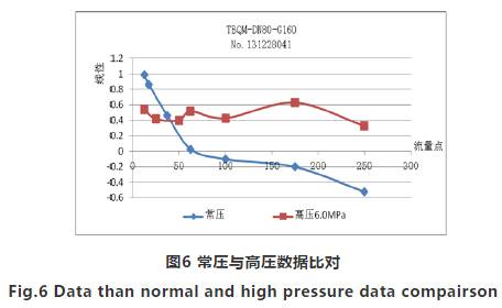 为了确认高压涡轮流量计在高压气体介质中计量性能是否满足工业贸易计量要求,将多台DN80-G160 样机发往*三方检测机构**石油天然气大流量计量站南京分站进行6 MPa 实流检定;检定合格,准确度等级为1.0 级,相对于常压检定数据样机的仪表系数K 有所偏移,但仍在允许误差范围内。其中南京分站使用小流量标准装置对编号为131228041 的DN80 涡轮流量计进行检定,该样机在常压与高压检定比对数据如图6 所示。而流量计的仪表系数K 的计算如下: