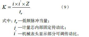 根据实际流量计的所测得仪表系数K 更换对应齿轮传动比,使机械表头显示部分和齿轮转动发出低频脉冲输出均与高频脉冲输出匹配,实际三者关系如下: