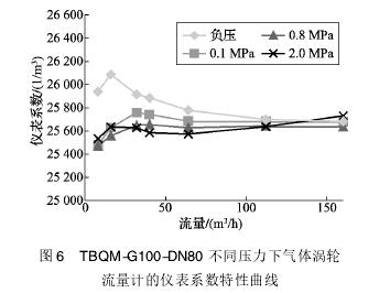 dn25气体涡轮流量计仪表系数受压力变化的敏感性较小,TBQM-G65-DN50的仪表系数变化的重复性仅为0.502%,而TBQM-G100-DN80的重复性仅为0.282%。随着工作压力的变化,涡轮流量计线性度变化不大。在4种不同压力下2台dn25气体涡轮流量计的仪表系数曲线型一致性很好,与理论的特性曲线有很好的符合性,只是对于DN50口径的dn25气体涡轮流量计来说,高压相较于低压曲线整体向上漂移,而DN80口径的dn25气体涡轮流量计相对稳定,波动更小。流量计符合欧洲标准EN12261的有关规定———*5.2.1.1款。压力的变化对仪表系数的影响小于流量变化的影响。