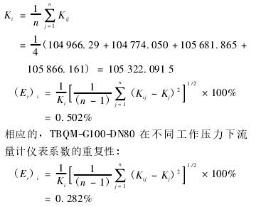 计算得出TBQM-G65-DN50在不同工作压力下流量计仪表系数的重复性: