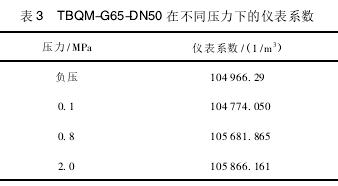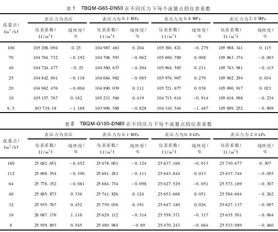 不同压力下每个流量计的仪表系数如表1和表2所示。