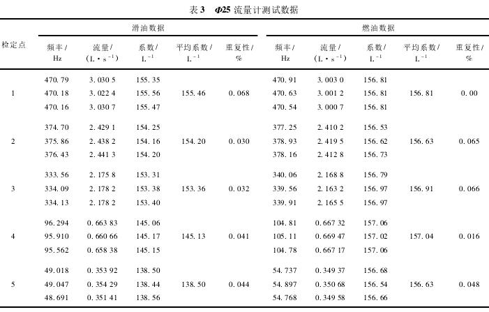 依据表3测试数据,经计算可得,Φ25流量计在滑油及燃油中测试结果如表4所示,测试线形图如图3所示。