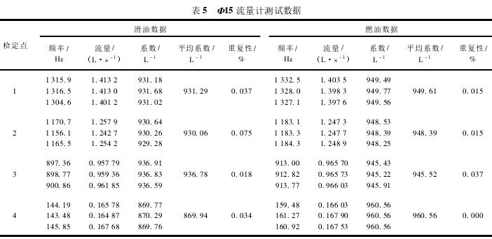 依据表5测试数据,经计算可得,Φ15流量计在滑油及燃油中测试结果如表6所示,测试线性图如图4所示。