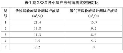 图1、图2为该井全井流量测试曲线,从图1可以看出使用传统涡流量计测试时该井流量曲线受到井内原油脱气影响产生了较大跳动,对流量测试产生了较大的干扰,测试结果为56.2m 3 /d。而采用溢气型气体涡轮流量表测试后,测试曲线较为平稳、冲次明显(图2),涡轮没有受到原油脱气影响,说明溢气型短节排气效果良好,全井流量测试结果仅为39.4m 3 /d。为了进一步对比,地质部门对该井进行了罐车量油,量油结果为产液39.1 m 3 /d。由此可见,溢气型气体涡轮流量表流量测试结果明显优于传统的气体涡轮流量表测试结果,那么其测试的各小层产液数据也就更加准确,因此测试脱气严重的抽油机井产液剖面时应该尽可能采用溢气型气体涡轮流量表。表1为喇XXXX井各小层流量测试结果,可以看出使用传统气体涡轮流量表测试的各小层流量均高于溢气型气体涡轮流量表测试结果。测试层5时传统气体涡轮流量表测试结果为2.2 m 3 /d,而实际上涡轮转动是气体冲击导致的,采用溢气型气体涡轮流量表后发现该层产液量低于启动排量无法测试。