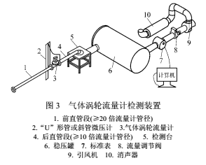 气体涡轮流量计的流量与压力测量装置如图3所示。主要包括四部分:测量段部分、稳压罐、标准表、引风机部分。测量段部分包括前直管段、“U”形管或斜管微压计、气体涡轮流量计、后直管段以及检测台;引风机部分包括流量调节阀、引风机以及消声器。
