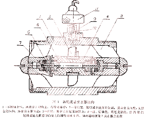 在固井过程使用卡箍式涡轮流量计, 主要解决涡轮变送器的耐高压、耐震以及高速下的耐磨蚀问题。在这方面, 我们采用了耐磨橡胶轴承 , 尼龙轴套, 单滚珠止推等措施, 基本上可以满足施工要求。结构主要由不锈钢壳体、导向架、叶轮和前后轴套组成, 见上图1。