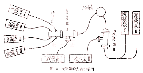 变送器II(卡箍式涡轮流量计)安装在水龙带与水泥头之间,信号送至二次仪表II,用以计量泥浆泵所替泥浆量