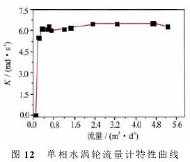 可以看出,涡轮启动后*先进入一个非线性段,在非线性相应段,K值随着流量增加而增大;当流量比较大(单相水超过0.5m3/d,单相油超过1m3/d)时,涡轮进入线性段,在线性响应段,K值达到峰值,有相对较小的波动。