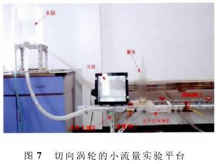 为了验证仿真的准确性,通过室内实验对其验证。切向涡轮采用可视化研究平台,整个涡轮的结构都采用亚克力板雕刻组装而成。如图7所示,水箱主要提供稳定水压,水平切向涡轮做成开口系统并放置在实验支撑架上,前置阀门可控制水流,在需要更换切向涡轮的零件时可关闭,控制阀门主要是控制流经切向涡轮的流量,流量测量仍采用传统可靠的容积时间法。实验时以染色剂作为示踪剂,以观察流场的分布情况。