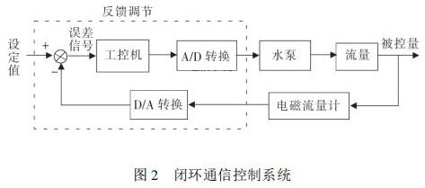 通信控制系统由工控机、变频器、水泵、数据采集卡、消防水流量计等组成。在整个热量表耐久性试验装置中,消防水流量计与被试验热量表串联在试验管路中。系统设定流量值 qs,通过工控机发送信号给变频器,来控制水泵运转,系统通过研华数据采集卡 PCI1711 将采集到的消防水流量计当前瞬时流量值反馈给工控机,工控机将返回流量值与设定流量值qs进行比较,从而确定是否需要重新调整变频器频率控制水泵转速。此过程是一个完整的闭环 PID 控制过程,其闭环控制过程如图 2 所示。 2. 2 管路切换系统管路切换主要由冷热水箱、水泵、开关阀等组成。要实现热量表耐久性 4000 次冷热冲击试验,需要实时控制管路中热水与冷水的交替使用。