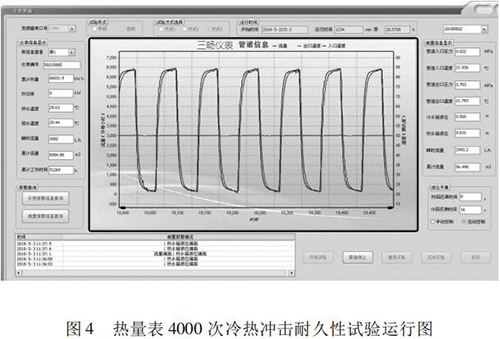 本文研究的 4000 次冷热冲击试验的实现具有以下特点: (1)基于“工控机 +水泵 + 消防水流量计”的闭环控制系统,实现了流量自动反馈调节,满足试验要求; (2)通过四个开关阀的时序切换,自动控制试验温度,很好的完成了 4000 次温度冲击试验; (3)通过“工控机 + 数据数据采集卡”的数据采集系统,实时监控试验过程中的流量、温度、压力等相关参数,实现试验方式的自动控制,并能对试验数据进行分析与评定。 (4)试验的全过程为智能自动化,可无人员留守看护。试验结果可直接反映出热量表在长时间运行后的可靠性。为我国热量表耐久性试验研究提供检测手段,为促进产品质量提升做好技术保障。