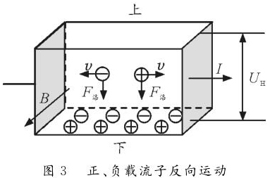 反之,如图2所示,若载流子带负电荷,则载流子在洛伦兹力作用下会向下偏转,导体下表面积累负电荷。同时,上表面失去负电荷而带上正电,从而使上表面电势高于下表面。