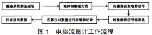 涡轮计量表的产生主要是基于法拉*电磁感应定律。在涡轮计量表的应用中,磁路系统会在流量计运行过程中逐步出现直流磁场与交流磁场,该磁场的产生为后期的测量提供了良好的前提条件,营造了测量所需的磁场环境,因此,在涡轮计量表应用时,一旦被测液体在导管中经过该磁场环境时,必然会产生一定的切割磁力线运动,在这种情况下,电*传感器就会发挥其作用,将导管内的流量转换为感应电势信号,随后此转换形成的信号逐步被传递给转换器。而转换器更是可以将所获得的流量信号等加以处理,通过分析、对比等,转换器会将该信号变为标准信号,随后将该信号输出给积算仪,进一步进行信号的处理,这些处理以后的信号*终会在涡轮计量表的仪表中显示,呈现*终的流量测量结果,其基本的流程如图 1 所示。