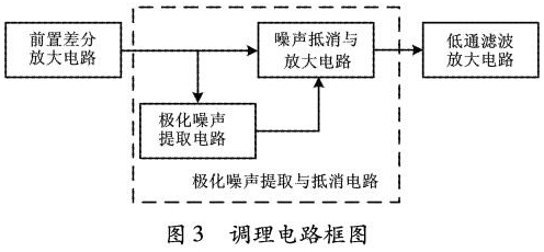根据前馈控制的自适应*化噪声抵消原理,设计了信号调理电路2,以实现*化噪声的滤除。信号调理电路2主要包括前置差分放大电路、*化噪声提取与抵消电路、低通滤波放大电路三部分。调理电路如图3所示。