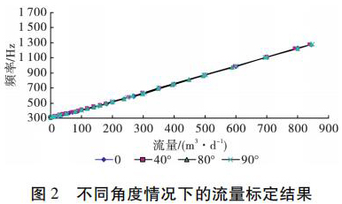 为了考察井眼斜度变化对测河水流量计测量流量的影响,开展了非集流测河水流量计在不同斜度情况下的流量测量模拟实验。模拟实验在大庆油田多相流实验室进行,仪器外径 38 mm,模拟井筒内径为 124 mm,实验介质是水,倾斜角度分别为 0°、40°、80°和 90°( 水平) ,流量范围为 5 ~ 850 m3 /d。实验结果表明,在仪器居中条件下,井眼斜度变化对测河水流量计的仪表常数没有影响,满量程误差不大于 4% ,因此可以应用测河水流量计进行水平井注水剖面测量。不同角度情况下的实验结果如图 2 所示。