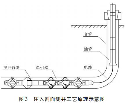 水平井注水井注入剖面测井工艺原理如图 3 所示。在垂直井段,仪器在重力作用下可以通过注入管柱下入到井内,注入管柱下端须装有喇叭口,且喇叭口应在造斜点以上,保证测井完成后仪器顺利起出,不发生卡仪器问题。仪器通过喇叭口以后在重力作用下继续向下移动,当仪器不能靠重力下移时,启动牵引器,利用牵引器将仪器推送到井底,上提电缆过程中进行测井。