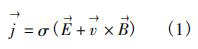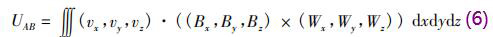 式中j→为电流密度矢量,为通过液体单位面积的电流,A/m2;E→为电场强度矢量,V/m;v→为流体速度,m/s;B→为磁感应强度,T。当激励电流角频率ω不大时,流体中的位移电流完全可以忽略,即