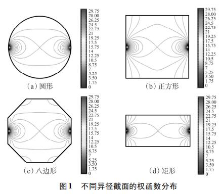 为考察不同异径截面权函数分布的均匀性,使用上述方法对圆形、正方形、八边形和矩形异径截面的权函数分布进行定性分析。为了便于对比,设置管道口径为DN100,异径部分截面积为3200mm2。所以,圆形异径面半径为32mm,正方形异径面边长为56.6mm,八边形异径面边长为25.8mm,矩形异径面长宽为80×40mm。仿真结果如图1所示,为了便于对比,权函数等势线大小从0开始,以0.25为步长递增到30。由图1(a)~图1(d)可知,矩形异径截面的权函数等势线间距*大,即权函数变化梯度*小,权函数分布*均匀。