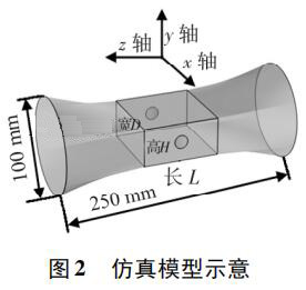 使用 Pro /E 软件建立三维几何模型,导入 COMSOL 软件进行有限元求解。仿真模型如图 2 所示,电*连线为x 轴,连线中点为坐标原点,流体运动方向为 z 轴,传感器管道口径为 DN100,总长250 mm。异径管部分初始结构尺寸 L = 80 mm,D = 80 mm,H = 40 mm,圆形电*半径为17 mm,伸出绝缘衬里的*大距离为 1. 5 mm。