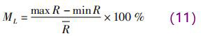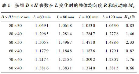 计算多组相同 D × H、不同 L 时 xy 平面的权函数整体均匀度 R 及波动率 ML,如表 1 所示。