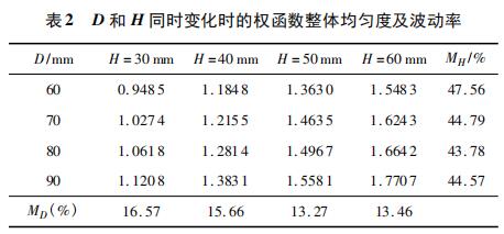 根据表 1 和表 2 权函数均匀度的波动率数值可以看出,MH > MD > ML,所以,矩形段 L,D,H 对于权函数均匀度的影响程度是依次增强的,高度 H 对权函数均匀度影响*大,宽度 D 影响稍小,长度 L 影响很小。且 D 和 H 越小,权函数整体均匀度 R 越小,权函数分布越均匀。