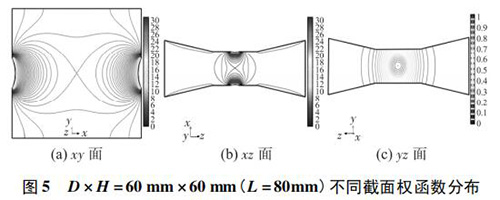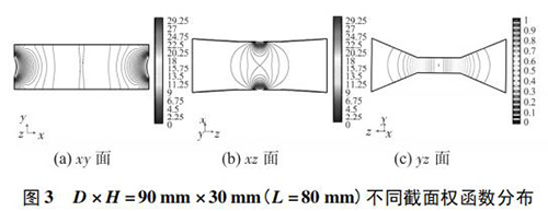 4) 图 3( c) 、图 4( c) 的 yz 面权函数分布表明,D = 90 mm时的权函数等势线间距略大于 D = 60 mm 时的权函数等势线间距,权函数变化梯度较小,且中心区域的权函数等势线逐渐变为直线,因此 D = 90 mm 的权函数分布更均匀一些,但是两者区别很小,即宽度改变对 yz 面权函数分布影响很小。图 4( c) 、图 5( c) 的 yz 面权函数分布表明,H = 30 mm时的权函数等势线间距较大,且中心区域的权函数等势线逐渐变为直线,因此 H = 30 mm 的权函数分布更加均匀;