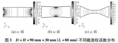 2) 图 4( a) 、图 5( a) 的 xy 面权函数分布表明,H = 30 mm时中心区域的权函数等势线间距较大,且中心区域的权函数等势线逐渐变为直线; 电*附近的权函数等势线比较稀疏,且等势线颜色较浅,权函数*大值较小,变化梯度小,因 此,H = 30 mm 时 xy 面的权函数分布更加均匀。