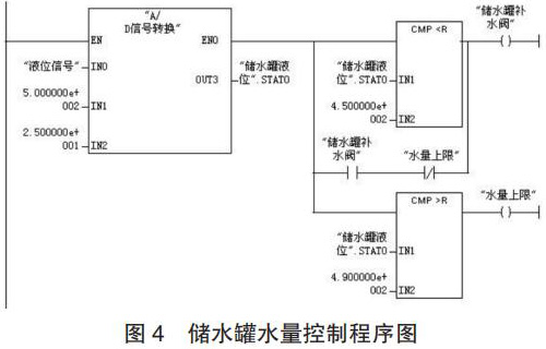(2)程序设计。储水罐水量控制的工作过程为:当压力变送器检测到储水罐的水量低于 450kg 时,补水阀 3 开启为储水罐补水;当水量达到 490kg 时,补水阀 3 关闭;生产配制过程中,循环以上控制过程。储水罐水量控制的程序如图 4 所示。