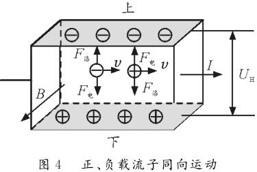 情形2:正、负载流子反向运动。如图3所示,长方体玻璃水槽中盛有NaCl的水溶液,水槽左、右侧壁内侧各装一导体片,在溶液中通入水平向右的电流,匀强磁?。麓怪敝矫嫦蛲?。NaCl溶液中既有正离子,又有负离子,根据左手定则可判断正离子受到向下的洛伦兹力,故向下运动并堆积。同理,负离子也受到指向下的洛伦兹力,也向下运动并堆积。由于正负离子均向下侧面堆积,故上下两侧面的电势均为零,但下侧面处离子浓度大于上侧面离子浓度。