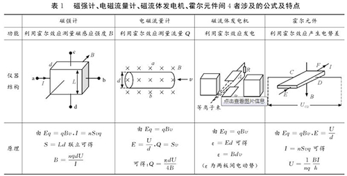 易错点2:磁强计、循环水流量计、磁流体发电机、霍尔元件间的区别与联系磁强计、循环水流量计、磁流体发电机、霍尔元件都是利用电磁场对带电粒子的偏转效应,并且稳定时电场力与磁场力均达到平衡。很多学生容易将其混淆,遇到问题常常搞不清原理,乱代公式,笔者特将4者涉及的公式及特点等做一对比区别如表1所示。