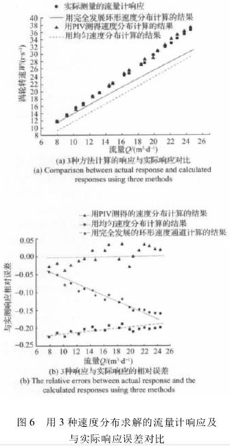 分别计算各个响应在不同流量点处与真实响应的相对误差,结果如图6(b)所示。从图中可以明显看出,用PIV获得的速度分布计算的结果与实际响应的相对误差*小,在3%以内;用均匀入口速度分布计算的结果误差*大;用完全发展的环形通道速度分布当雷诺数超过2000时,由于计算模型假设由层流的速度分布直接转变为湍流的速度分布模型,未能合理地反映实际流动中逐步转变的过渡阶段,导致理论结果与实际速度分布有较大差异,所以误差较大。通过这些对比不难看出,获得真实的速度分布能更为准确地计算柴油计量表的实际响应。面对复杂的上游来流条件,PIV结果更能反映柴油计量表内部流动的主要特征,这也从另一个侧面表明,对柴油计量表内部复杂流动的精细测量和深入认识也将是完善相关理论和进一步优化其性能的重要途径。
