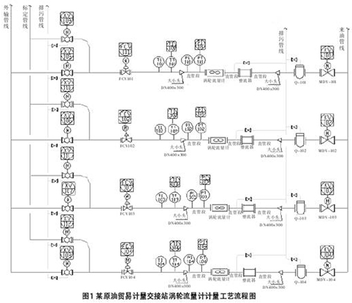 以某原油贸易计量交接站要求满足输量1500×104t/a为例,折算到流量为2100m3/h,若采用3用1备,单路流量至少需达到700m3/h。根据计算,选择流量范围为(200~2000)m3/h的DN250螺旋型柴油流量表较为合适;3用1备,每1路的流量使用在(900~1400)m3/h,每路流量在1400m3/h左右即可满足输量的要求。柴油流量表是一种速度式流量计,流态对其测量准确度的影响较大,应配备足够长的直管段及整流器以保证柴油流量表进口端有良好的速度分布,以提高测量准确度等级。其工艺流程如图1所示。