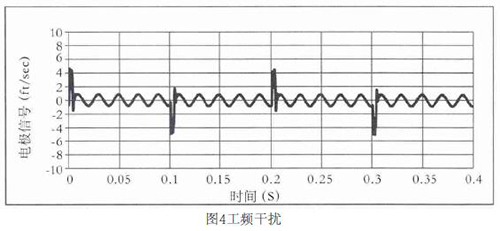 工频干扰是酒精流量计常见的干扰源。当流量计处于电源形成电磁场中时,由于分布电容的存在,以电磁波的辐射形式干扰电*信号,或者是由供电电源引入的工频串扰,工作现场的工频共模干扰,其产生的物理机理均是电磁感应原理。幅度与流量信号相比,往往要大几个数量级,频率与供电电源频率相同。如图4所示,线圈驱动频率为5Hz的电*信号,被耦合了50Hz的工频干扰,幅度大概相当于1feet/s。
