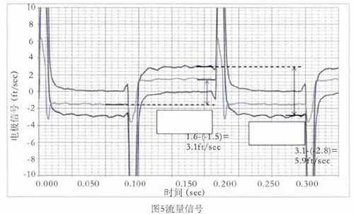 举例,如图5所示,线圈采用5Hz驱动时的0feet/s,3.1feet/s,5.9feet/s流速下的电*信号,利用上述方法对信号进行处理并计算流速。取每半波*后的20%纳入流速计算,正半波与负半波相减即是流速。如3.1feet/s–(-2.8feet/s)=5.9feet/s,虽然有+0.15 feet/s的直流偏置,但也不影响流速的计算。因线圈是5Hz驱动,半波的20%是20ms,正好是1个完整的工频周期,这样就不受工频干扰的影响。正半波与负半波相减,这样就避免了直流偏置和共模干扰的影响。再加上在数字滤波过程中使用限幅滤波和算数平均,保证了流量信号的有效提取。