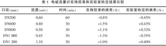 近几年来,通过一系列的现场试验,利用上述方法对液体流量计进行在线的校准,取得了比较可信的结果。表1显示了对不同口径规格的电磁流量计进行在线校准的示值误差结果和实验室标准装置上检定结果的比较情况: