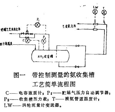 卫生型液体涡轮流量计安装在氨收集槽液氨管道上,带控制测量的氨收集槽工艺简单流程是:当320kg/cm2液氨送入收集槽,降压到16kg/cm2,氨在收集槽内进行气液相分离,分离后的贮罐气送出管路,分离后的液氨,经液氨管道送到液氨仓库(如‘图一所示)