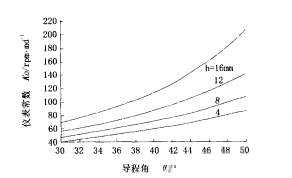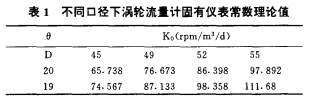 (2)可见,对确定的涡轮流量传感器,易知口径D大,K。值??;叶片数n大,K。值大等。如果要获得较大的仪表常数,就一要对涡轮传感器的结构参数进行优化设计,从图(2)可以看出,叶片高度h增加,K。增大;导程角增大,K。增大。对于φ19的过环空大排量涡轮流量计而言,由上式计算得K。=74.567rpm/m³/d,而水中标定的Kw=78.89rpm/m³/d,表1给出不同口径和不同导程角下涡轮流量计固有仪表常数的计算值。