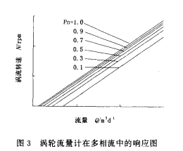 由于机械加工及安装工艺等方面的原因,按涡轮流量计固有仪表常数设计的涡轮,必须在水中标定后才能使用,设水中标定的涡轮仪表常数为Kw,则通过上述理论计算和实验,归纳总结出涡轮流量计在多相流动中的响应方程为:
