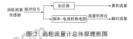 涡轮的旋转角速度是通过装在机壳外的传感线圈来检测。当涡轮叶片切割由壳体内永久磁钢产生的磁力线时,就会引起传感线圈中的磁通变化。传感线圈将检测到的磁通周期变化信号送入前置放大器,对信号进行放大、整形,产生与流速成正比的脉冲信号,送入单位换算与流量积算电路得到并显示累积流量值;同时亦将脉冲信号送入频率电流转换电路,将脉冲信号转换成模拟电流量,进而指示瞬时流量值。图2为涡轮流量计总体原理框图。