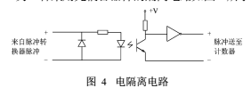 电路中,采用光耦合器件来隔离脉冲计数器与脉冲转换器,使它们之间没有电的连接,脉冲转换器由独立的隔离电源供电,保证其正常工作,正常的脉冲信号能够驱动光耦合器件,使其能顺利通过隔离电路;而串入的干扰信号带负载能力很低,而且主要是共模信号,不能驱动光耦合器件而被隔离,从而有效地消除了干扰。